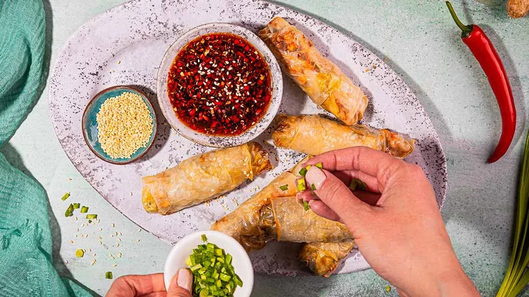 Sprinkle the finished rolls with the roasted sesame seeds and chopped spring onions, and serve with the citrus and ginger dip.