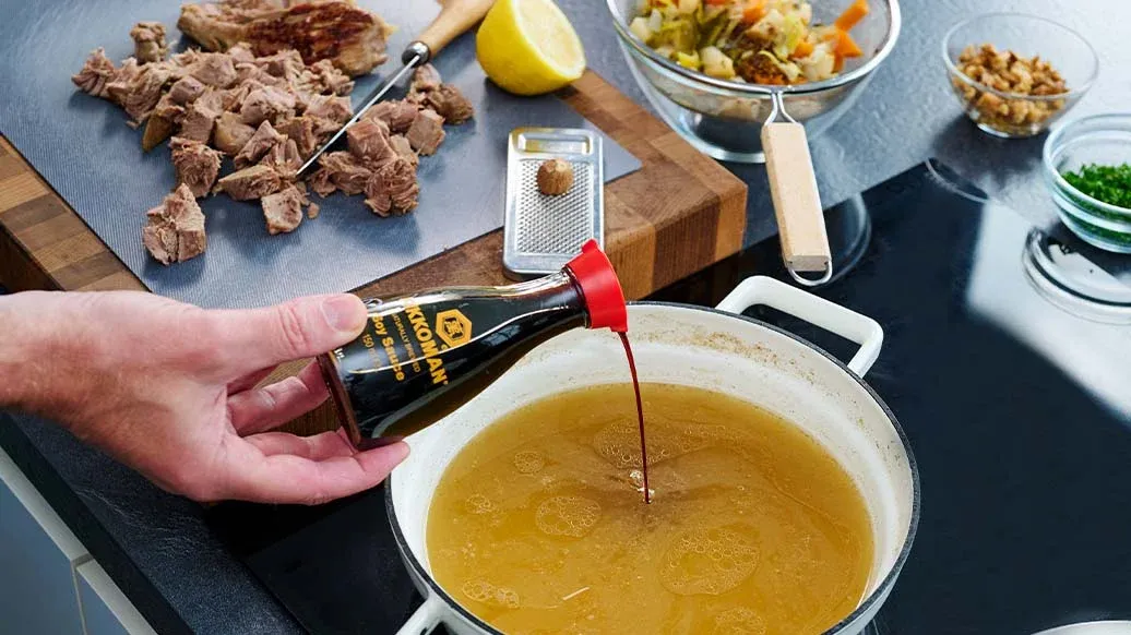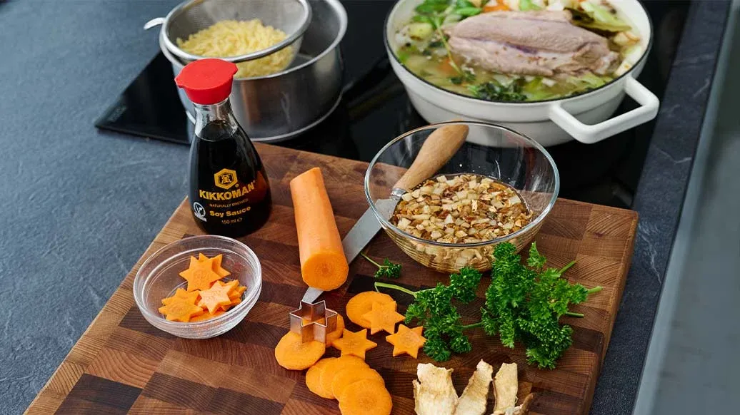 A festive poultry broth with carrot, celeriac and leek, enriched with Kikkoman Soy Sauce and fragrant spices. Served with noodles and mushrooms, this comforting soup is a warming centrepiece for any winter table.