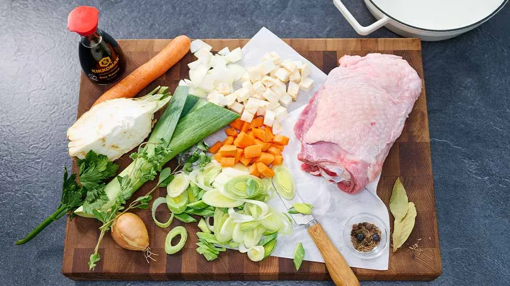 1 carrot – 1 piece of celeriac – 1 small onion – 1 leek – 1 turkey leg, about 1.2 kg – 2 bay leaves – 2 juniper berries – ¼ black peppercorns – 4 allspice berries – ¼ tsp caraway seeds – 4 sprigs marjoram – 3 tbsp Kikkoman Naturally Brewed Soy Sauce