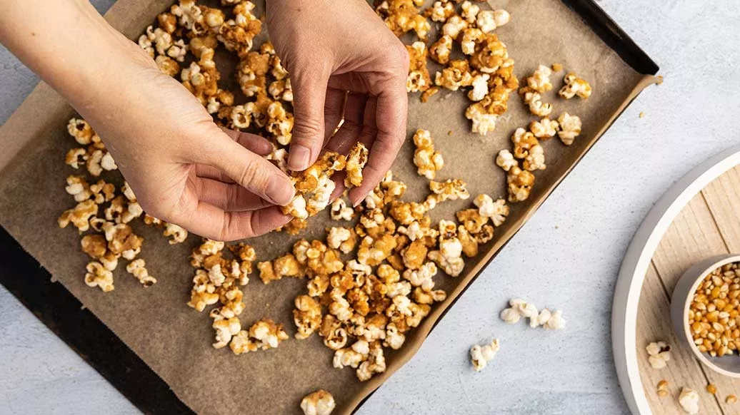 Spread the caramel popcorn on a large baking tray lined with greaseproof paper. Wait for it to harden, then crumble it into pieces and return it to the bowl.