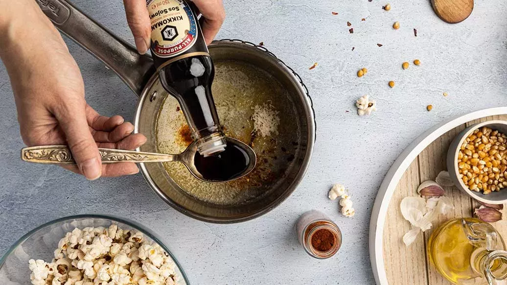 Melt the butter in a saucepan, then add the Kikkoman Soy Sauce and spices (garlic, pepper and chilli). Pour the mixture over one of the bowls of popcorn, add the Parmesan cheese and mix thoroughly so that the popcorn is coated with the spices.