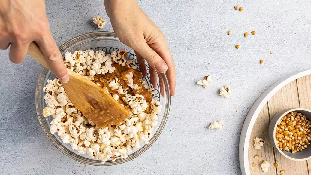 To prepare the caramel, pour the sugar and water into a pan. Heat them until they dissolve without stirring. Gently swirl the pan to distribute the sugar evenly. When it turns golden, add the butter and Kikkoman Soy Sauce. Stir and pour over the other bowl of popcorn.