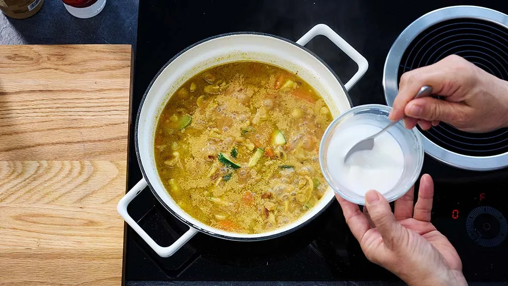 Dissolve the cornflour in water. Add it to the curry and stir continuously until the sauce comes to a gentle boil and thickens. Add the garam masala at the very end of cooking, then turn off the heat.