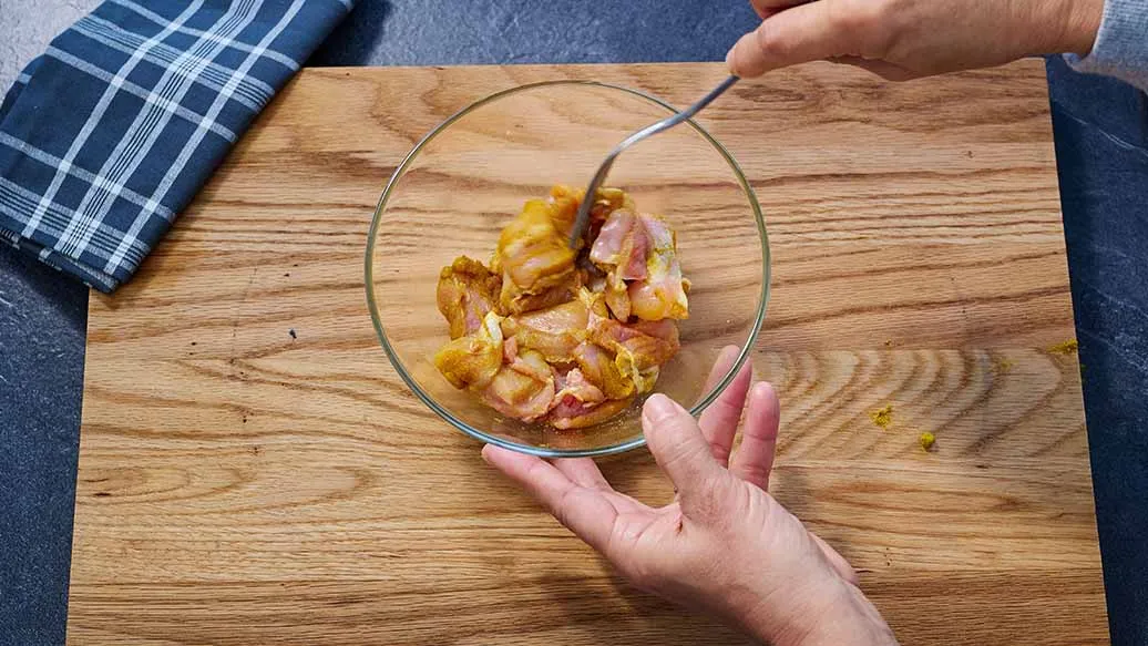 200 g chicken thigh or breast – 1 tsp curry powder – 1 pinch salt