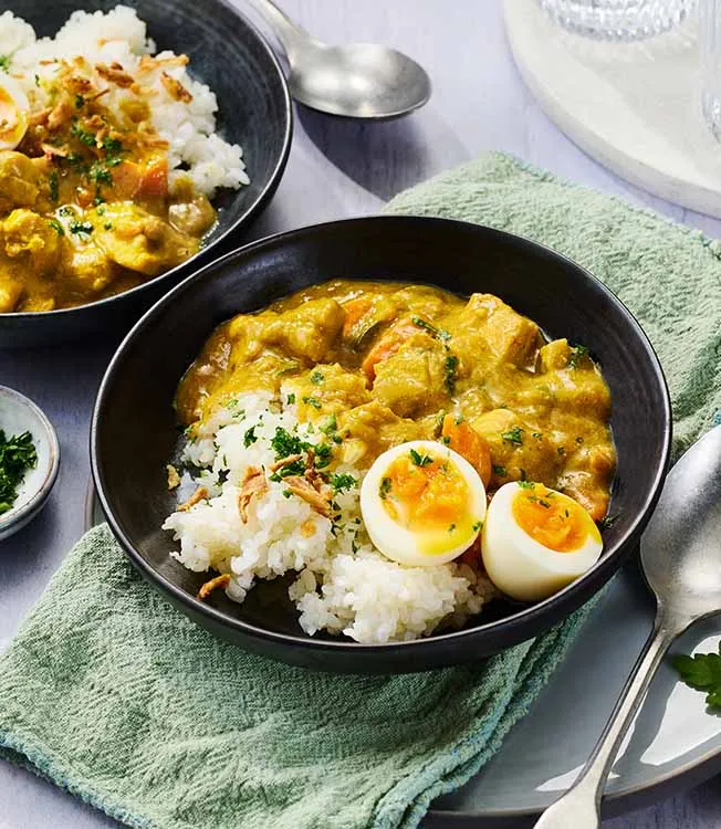 Serve the rice on each plate and ladle the curry over it. Top with the eggs, fried onions and parsley to finish.