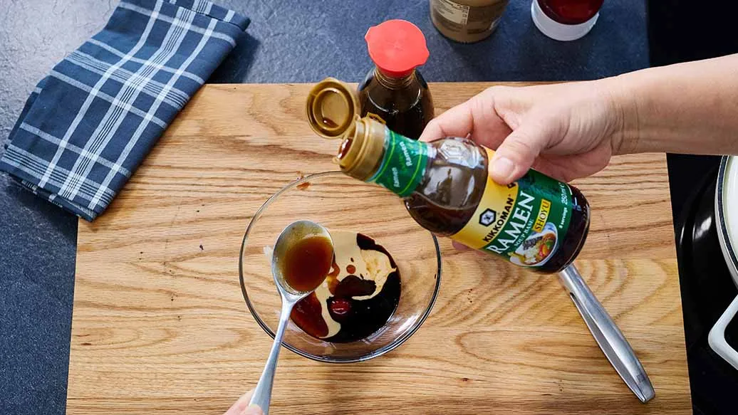 1 tbsp Kikkoman Naturally Brewed Soy Sauce – 1 tbsp Kikkoman Concentrated Ramen Noodle Soup Base - Shoyu (Soy Sauce) Flavour – 1 tbsp ketchup – 1 tbsp tahini