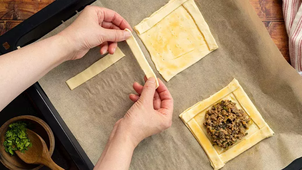 Brush all the surfaces with the egg. Lay the 4 strips on all edges. Place the filling prepared in step 1 in the middle and brush the edges again with the egg.