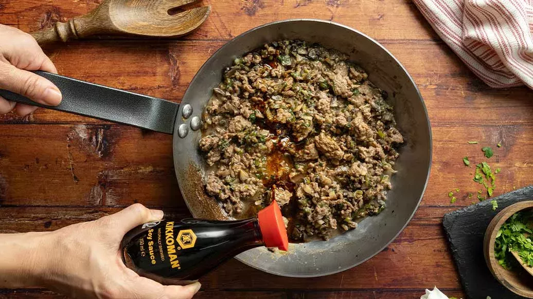 1 tbsp Kikkoman Toasted Sesame Oil – 150 g minced beef – 2 spring onions – 4 mushrooms – 1 tbsp miso – 1 tbsp sugar – 1 tbsp Kikkoman Naturally Brewed Soy Sauce – 1 tbsp water – 1 tbsp cornflour or potato starch (dissolve with an additional tbsp of water) – 1 pinch of black pepper