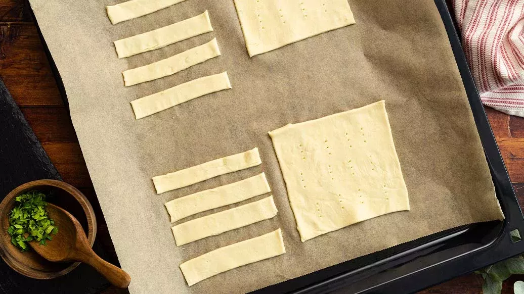 Unroll the puff pastry sheets and cut them into 8 squares (8 x 8 cm), then cut 4 of them into 4 long strips (2 x 8 cm each).