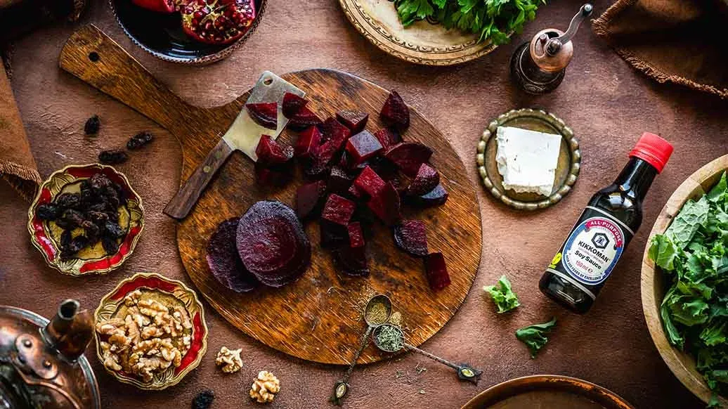 A vibrant Middle Eastern–inspired salad with roasted beetroots and kale, sweet raisins and bursts of pomegranate. Finished with walnuts, feta and a thyme–soy dressing, it’s a colourful highlight for any seasonal gathering.