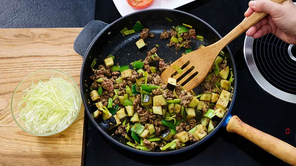Heat the rapeseed oil in a frying pan over low heat. Add the garlic and ginger from Step 1 along with the cumin seeds and sauté gently until fragrant. Grill the tomato cut-side down in a free space in the pan until lightly browned. Add the chopped leek and curry powder and stir-fry briefly. Turn the tomato over; once slightly softened, remove it from the pan and set aside. Add the mince and cook until lightly browned. Drain the aubergine cubes and add them to the pan along with the water, cover and simmer over low heat for 15 minutes.