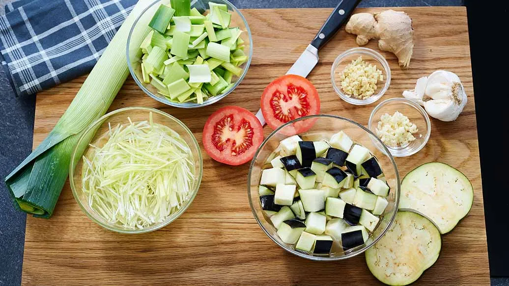 5 g garlic – 5 g ginger – 1 leek – 120 g aubergine – 1 medium tomato (approx. 70 g)