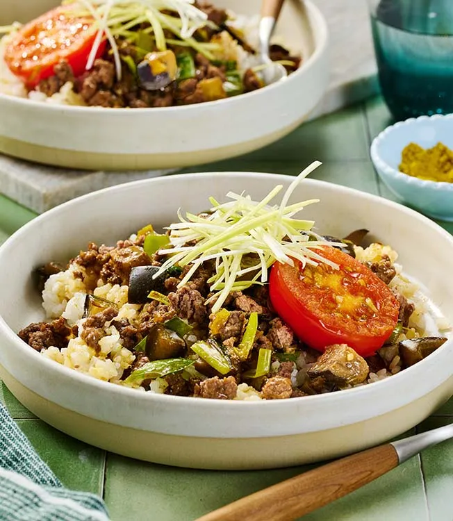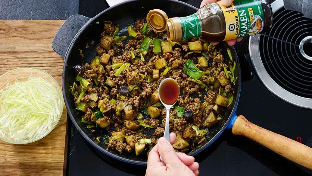 This Japanese curry uses leeks instead of onions for a lighter yet deeply savoury dish. Aubergine absorbs rich umami from minced meat, Kikkoman Soy Sauce and Kikkoman Ramen Soup Base. Fresh tomato and raw leek add crunch and balance.