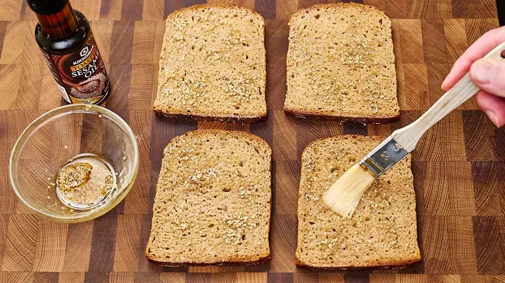1 garlic clove – 1 tbsp Kikkoman Toasted Sesame Oil – 1 tbsp sesame seeds – 4 large slices of dark country bread (as square as possible)