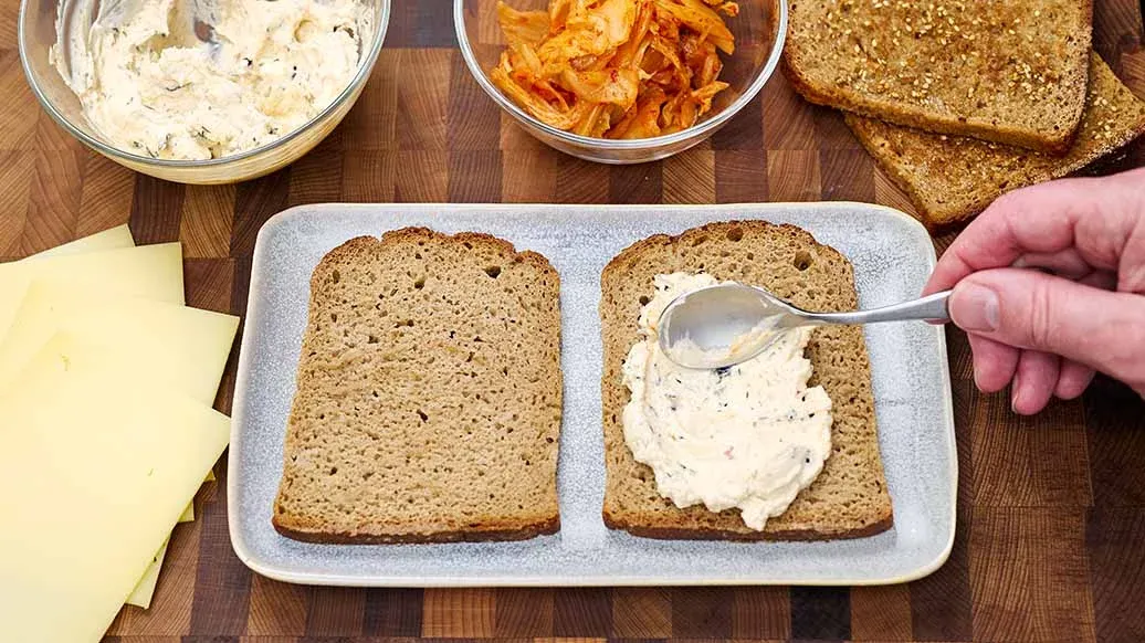 Spread the cream cheese mixture over the untoasted side of the bread slices, then layer with the cheese, kimchi, mushrooms and another slice of cheese. Top with the remaining bread slices.