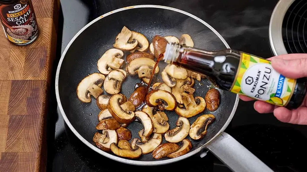 Cut the mushrooms into slices approx. 2 mm thick and fry in 1 tbsp heated Kikkoman Sesame Oil for approx. 3 minutes. Add the Kikkoman Ponzu Lemon and continue to fry until it has evaporated and the mushrooms are glazed. Season with the pepper.