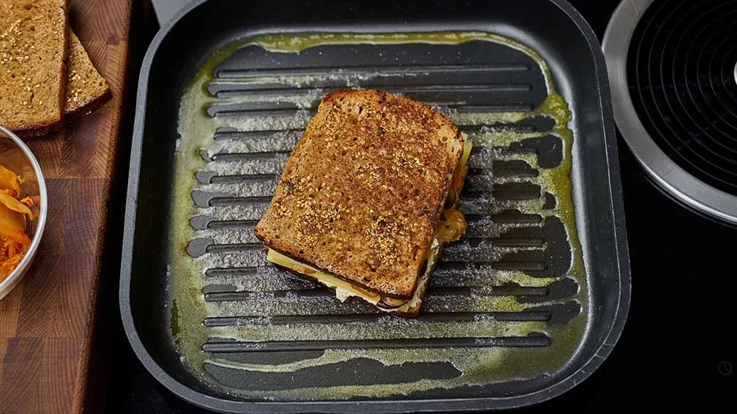 Cheese it up! Crispy sesame-garlic country bread meets spicy kimchi and melted cheese in this grill-toasted sandwich that’s sure to win over any sandwich lover.