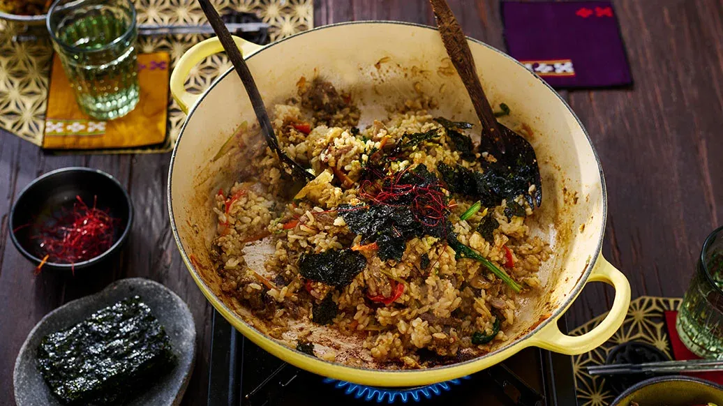 Thin slices of beef or pork—or tofu—marinated in Kikkoman Teriyaki Sauce with Toasted Sesame, layered with vegetables and simmered at the table, then finished with eggs.