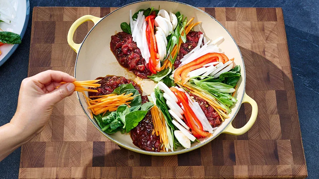 Put the Kikkoman Sesame Oil in a pot. Divide the marinated meat from step 1 into 5 portions and arrange in a circle with spaces in between. Place the vegetables from step 2 evenly around the meat in the same circular pattern.