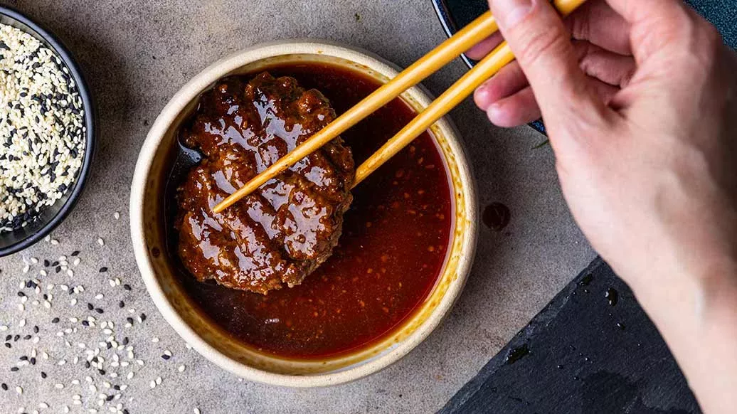 Taste the Seoul in every bite! A burger boasting a soft bao bun with kimchi and crunchy red cabbage salad, kimchi mayonnaise sauce and a juicy beef patty. Crowned with Kikkoman Teriyaki Sauce with Garlic, it's a flavour adventure from the heart of Korean cuisine.