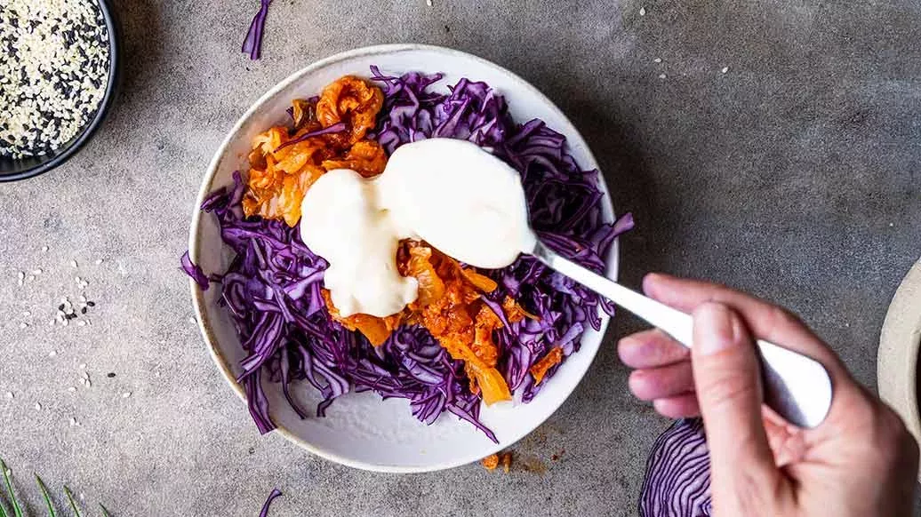 100 g red cabbage – 50 g kimchi – 1 tsp rice vinegar – 1 tsp honey – 1 tbsp mayonnaise