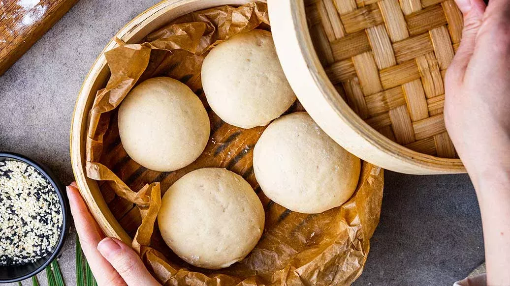 Make a soft yeast dough from the ingredients listed. Cover and leave to rise in a warm place for about 60 minutes. Shape into 4 buns, set aside to rise again, then steam for about 8 minutes.