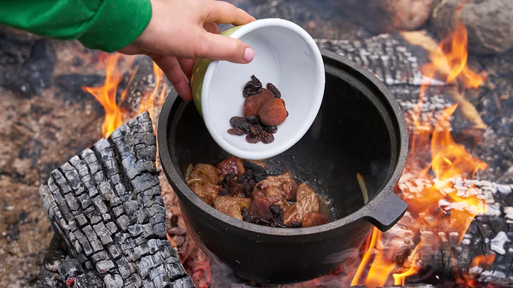 Sear the lamb with the onion wedges and spices in the rapeseed oil in a pot. Add the dried fruits and raisins, pour in enough stock or water to cover and braise covered for 45 minutes.