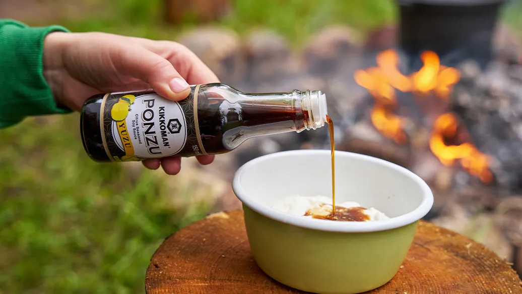160 g natural yoghurt – 30 ml Kikkoman Ponzu Citrus Seasoned Soy Sauce - Yuzu – A few mint or coriander leaves for garnish