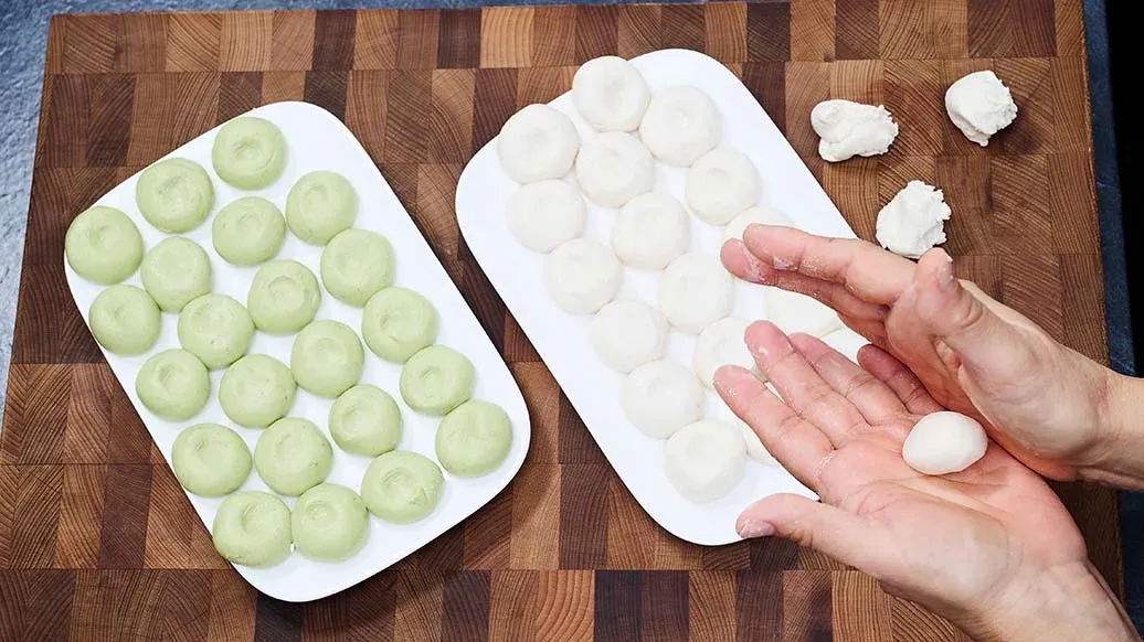 Pat the tofu very dry and mix it well with the rice flour, sugar and vanilla sugar. Divide the dough into two halves and knead the matcha powder into one portion.