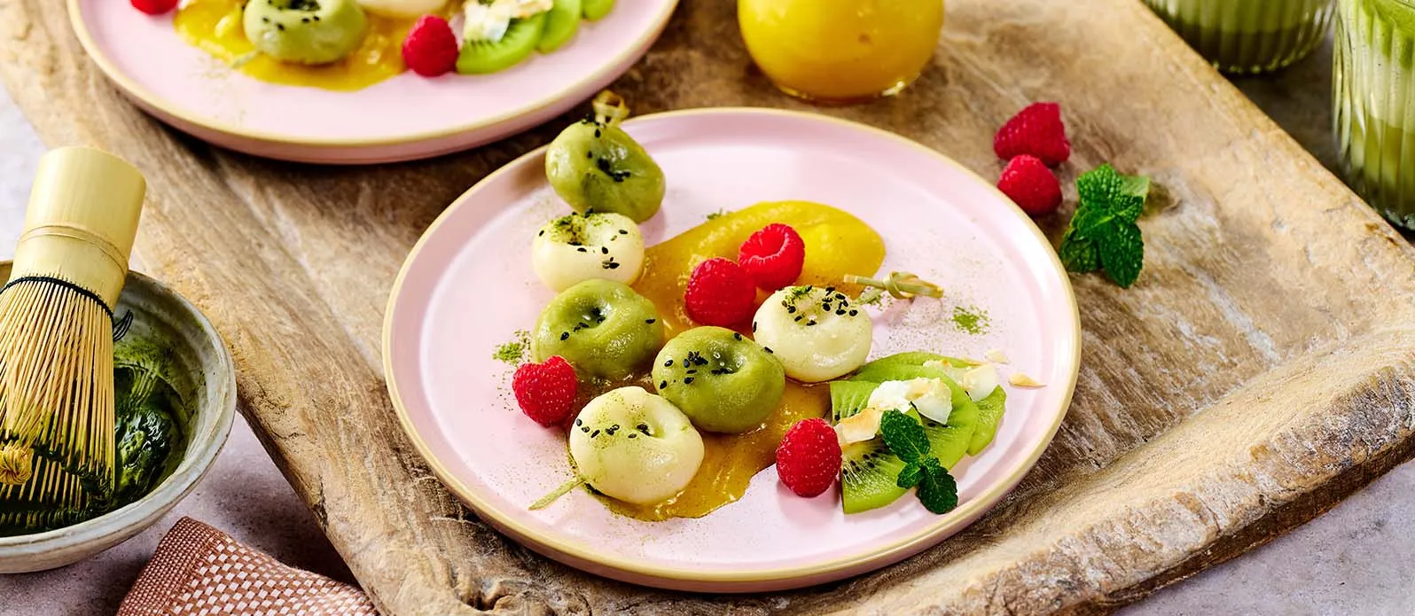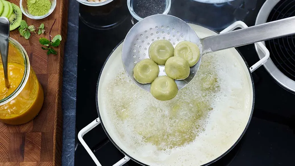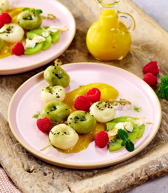 Once the dumplings are cooked, lift them out, cool them briefly in cold or iced water and drain well. Serve them on plates with the mango sauce and garnish with the kiwi, mint, a little matcha powder, black sesame seeds, coconut flakes and raspberries.