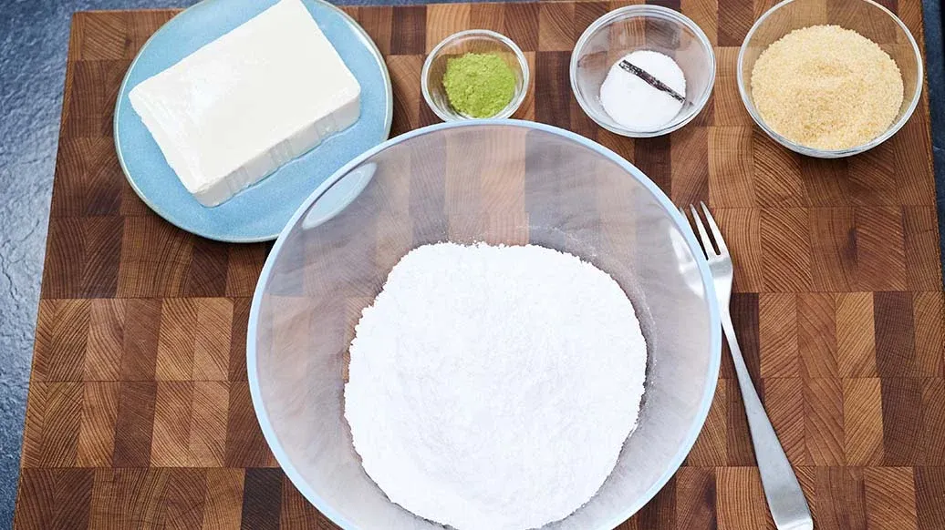200 g silken tofu – 200 g rice flour – 3 tbsp brown sugar – 2 tsp vanilla sugar with bourbon vanilla – 1 tsp matcha powder