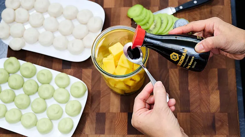 400 g mango flesh – 4 tsp Kikkoman Naturally Brewed Soy Sauce – 2 tsp Kikkoman Mirin-Style Sweet Cooking Seasoning – 2 green kiwi