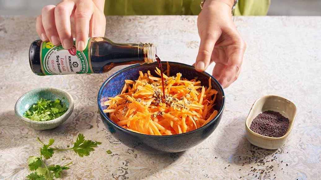 150 g carrot, coarsely grated – 1 tbsp ginger, chopped – 1 tsp black mustard seeds – 2 tbsp oil – 1 tbsp Kikkoman Naturally Brewed Less Salt Soy Sauce – ½ tsp dried chilli flakes – A few coriander leaves