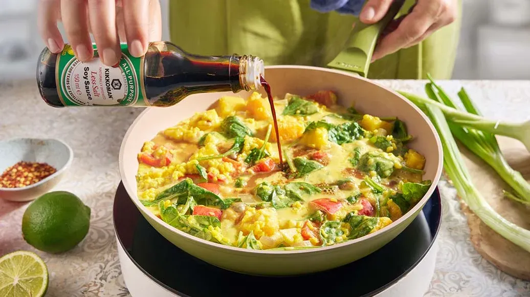Peel the squash and cut into large cubes. Cook the lentils with the squash and turmeric in the water for 20 minutes. In a pan, sauté the shallot and red pepper in the coconut oil for 2–3 minutes, then add the garlic and ginger and cook for 30 seconds. Stir in the cooked lentils with the squash, pour in the coconut milk and simmer for 5 minutes. Add the mango and spinach and cook for 1–2 minutes. Season with the lime juice and Kikkoman Less Salt Soy Sauce.