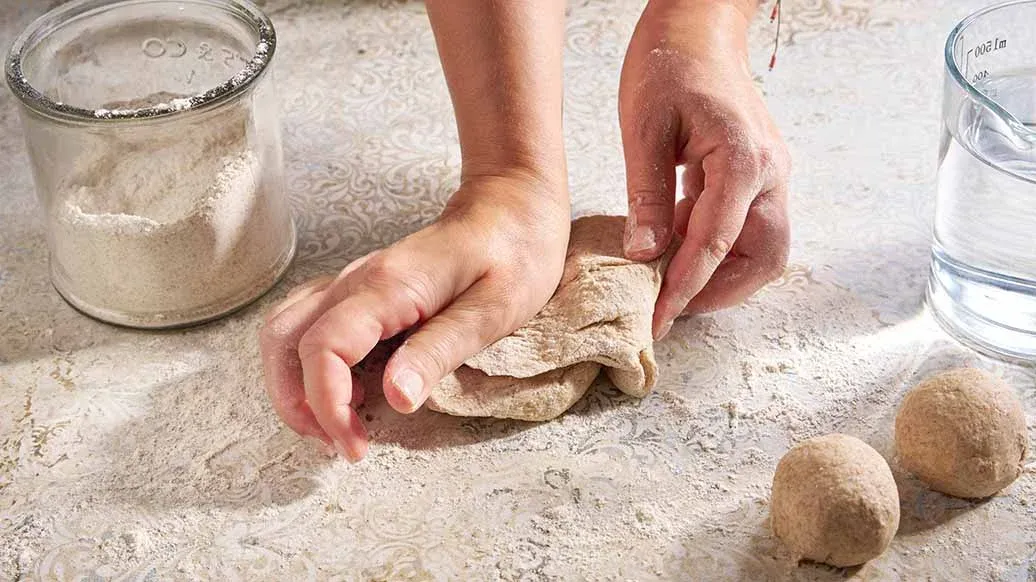 150 ml wholewheat flour – 20 g additional flour for dusting – 100 ml warm water – 20 g clarified butter (ghee), melte