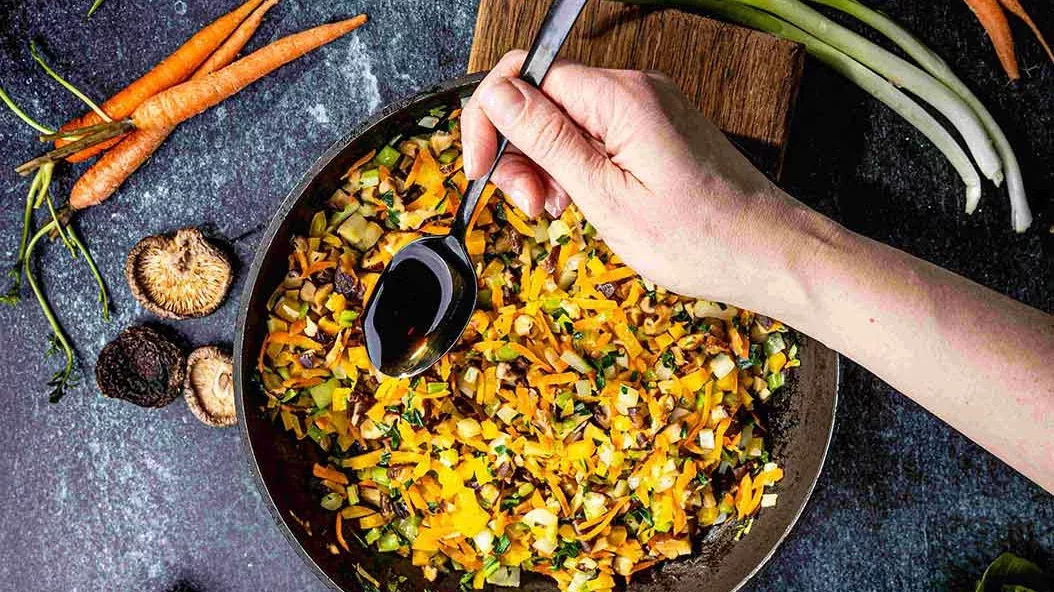 Soak the mushrooms in hot water and leave to stand for 15 minutes. Chop the pak choi. Shred the carrot with a large grater and finely chop the pepper and garlic. Sauté the vegetables in Kikkoman Sesame Oil, then add the chopped mushrooms and Kikkoman Soy Sauce. Fry for a few minutes, stirring constantly, until the vegetables are soft. Set aside to cool.