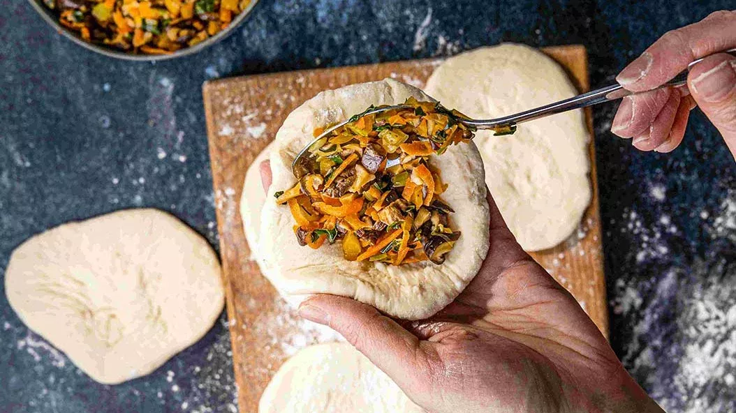 Divide the dough from step 1 into 6 equal parts and shape each into a ball. Roll out into a flat disc. Place the filling from step 2 on each disc and seal the edges to form a pouch.