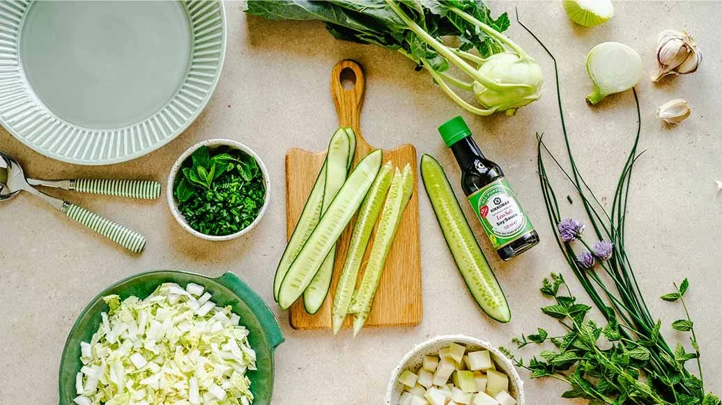 Finely shred the cabbage and dice the kohlrabi. Remove the seeds from the cucumber and set them aside. Slice the remaining cucumber. Combine the vegetables with the chopped chives and mint leaves.