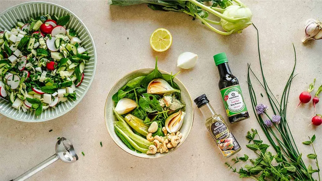 50 g spinach – 1 small onion – 1 garlic clove – 3 tbsp olive oil – 2 tbsp Kikkoman Naturally Brewed Less Salt Soy Sauce – 1 tbsp Kikkoman Seasoning for Sushi Rice (125ml) – 1 tbsp lemon juice – 1 tbsp nutritional yeast flakes – 2 tbsp roasted cashews