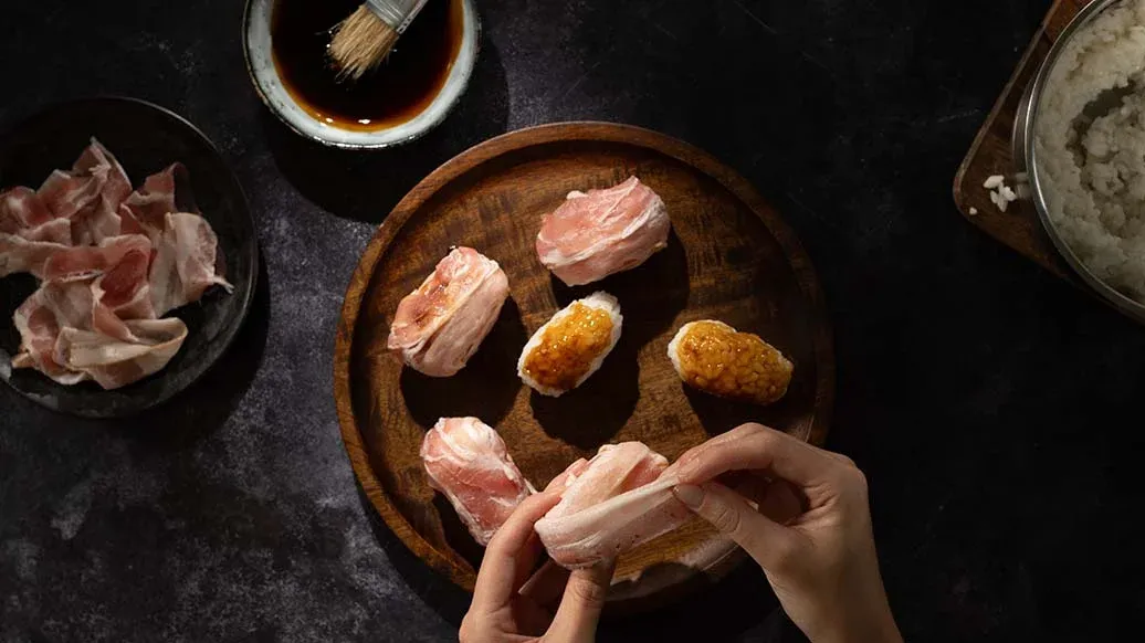 Shape the sushi rice into 6 thick rolls with moist hands. Brush lightly with the Kikkoman Teriyaki BBQ-Sauce Honey and wrap each roll in 2 strips of bacon.