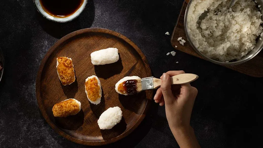 Place the onigiri on a plate. Bring the Kikkoman Teriyaki BBQ-Sauce Honey to the boil in the pan and turn the onigiri in the sauce.