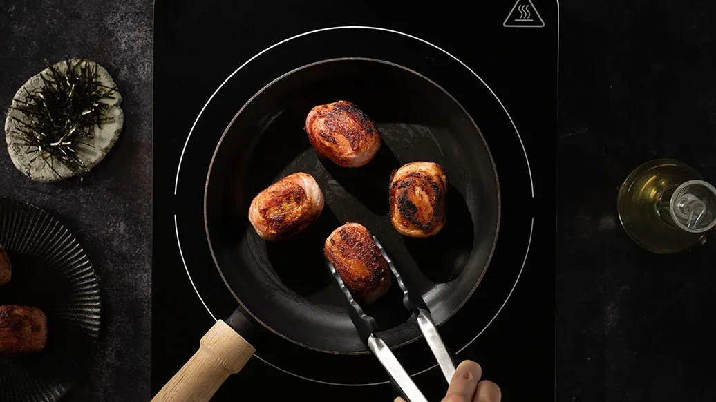 Nikumaki onigiri are best enjoyed straight from the pan, but you can also wrap them up and take them with you as a snack—just roll them into the salad leaf to eat by hand.