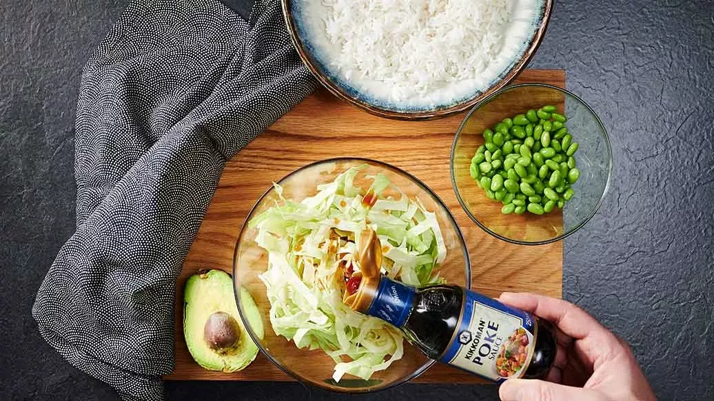 Blanch the edamame beans for 1 minute. Slice the cabbage thinly and combine with Kikkoman Poke Sauce. Cut avocados into slices.