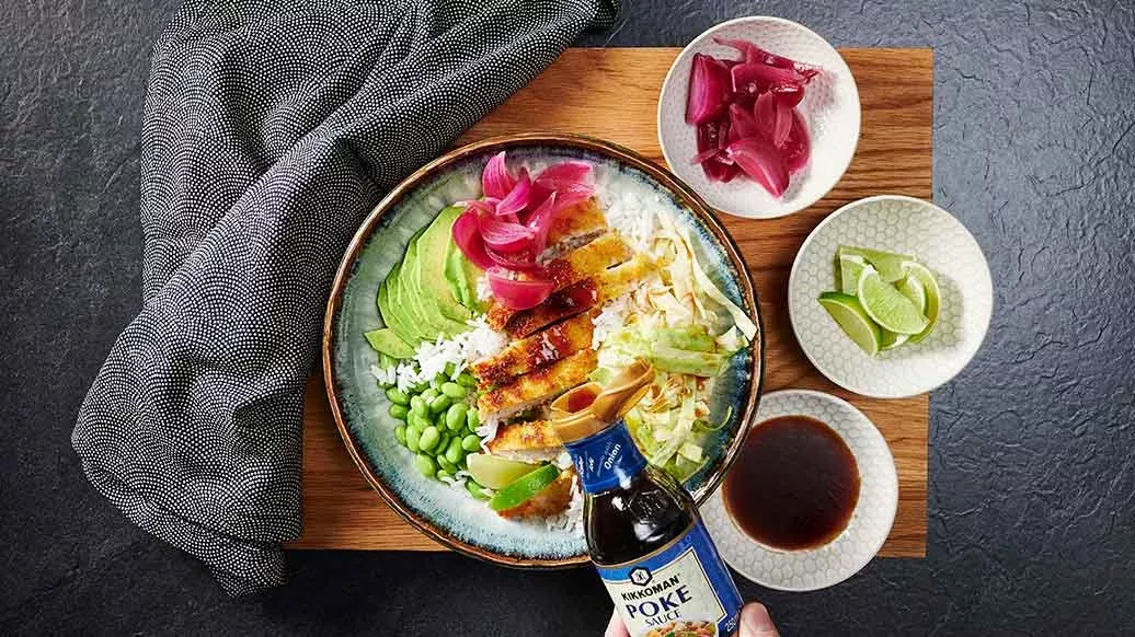 Place the cabbage, avocado, edamame beans, pickled onion and chicken on top of the rice. Serve with extra Kikkoman Poke Sauce and lime wedges on the side.