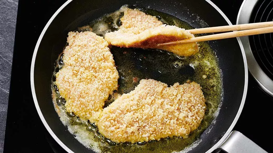 Pound the chicken fillets to an even thickness of approx. 1 cm. Coat the chicken fillets on both sides in flour seasoned with salt, pepper and curry powder. Then dip them into the beaten egg and, finally into panko breadcrumbs. Fry the chicken in oil for approx. 5 minutes on either side and leave to drain on kitchen paper to get rid of excess fat before slicing them.