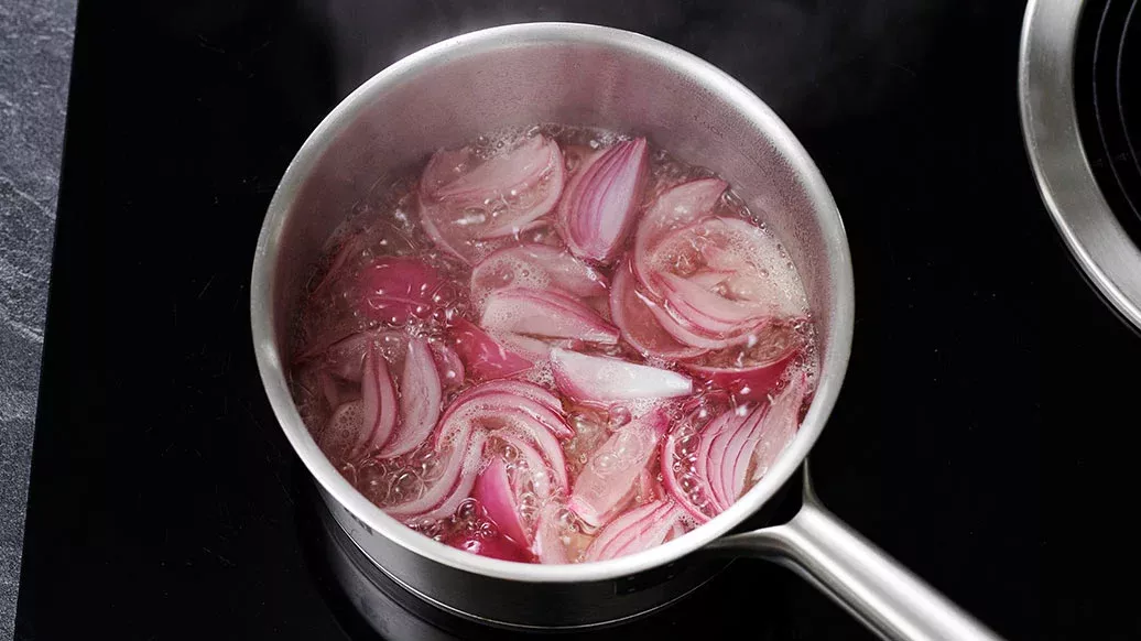 Cut the onion into wedges. Bring the water, vinegar and sugar to the boil and let the onion wedges simmer in this mixture for 1 minute. Turn off the heat and leave for a minimum of 15 minutes.