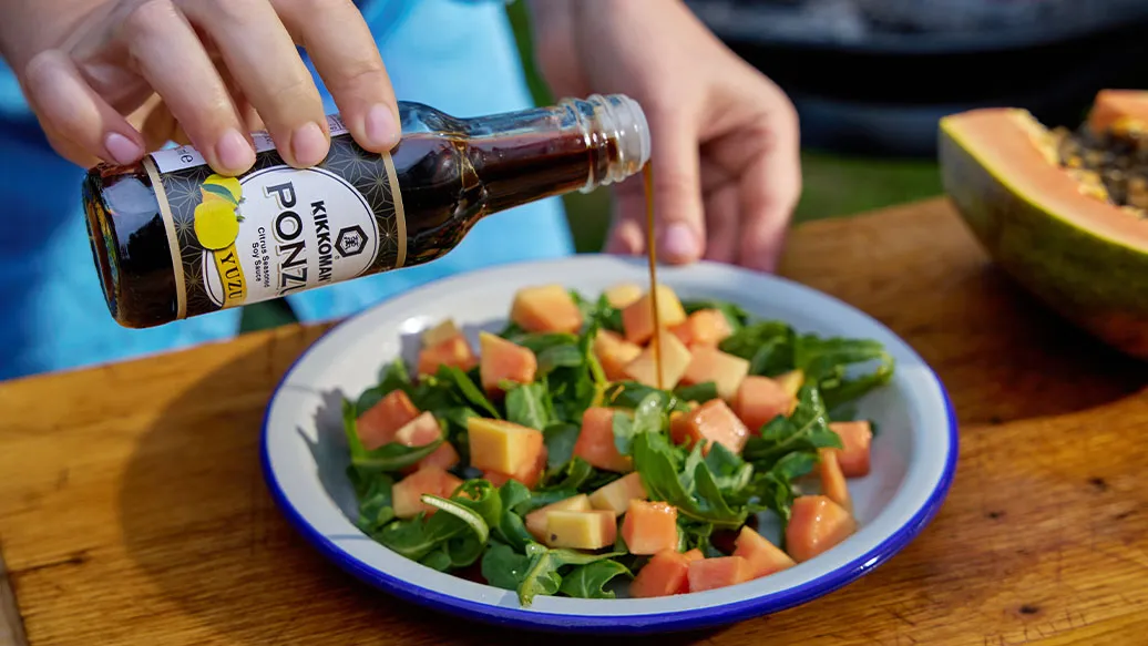 200 g papaya – 60 g rocket – 40 ml Kikkoman Ponzu Citrus Seasoned Soy Sauce - Yuzu