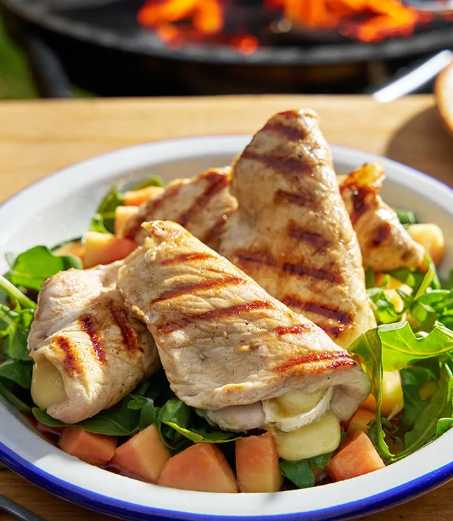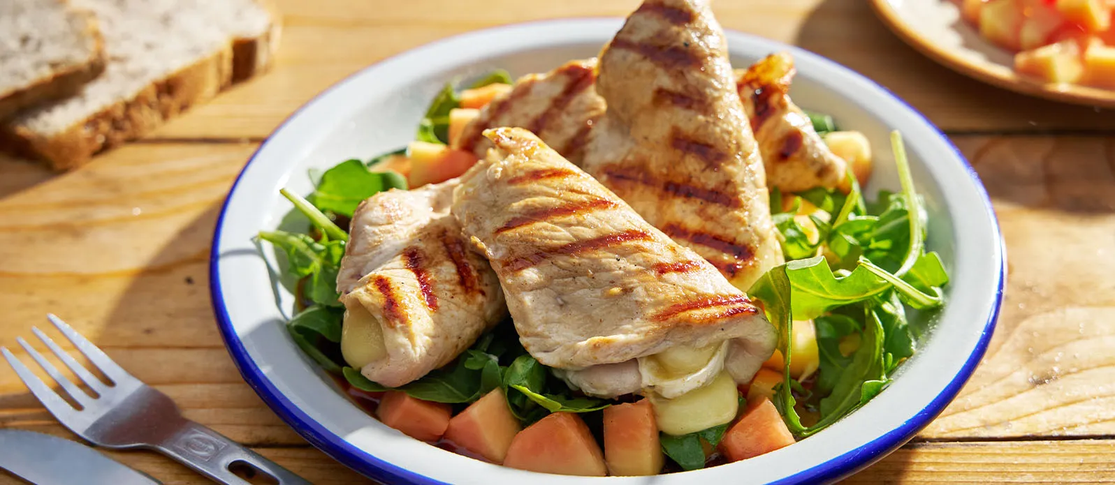 Juicy pork loin pockets with creamy brie, served on a papaya and rocket salad drizzled with Kikkoman Yuzu Ponzu.