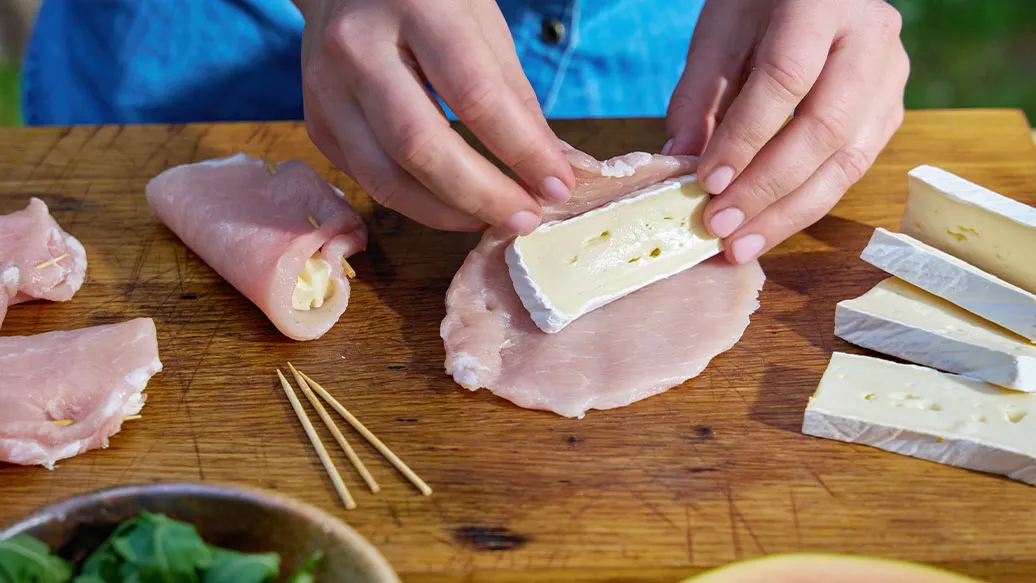 Pound the pork loin slices, place some brie inside, fold over to form a pocket and secure with toothpicks.