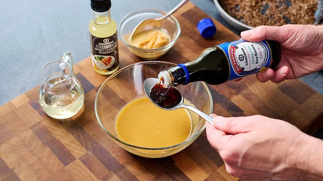 For the dressing, whisk the miso paste with 2 tbsp water, the vinegar, oil, Kikkoman Gluten free Soy Sauce and Kikkoman Mirin-Style Sweet Seasoning, then season with the pepper. Toast the linseed in a small non-stick frying pan.